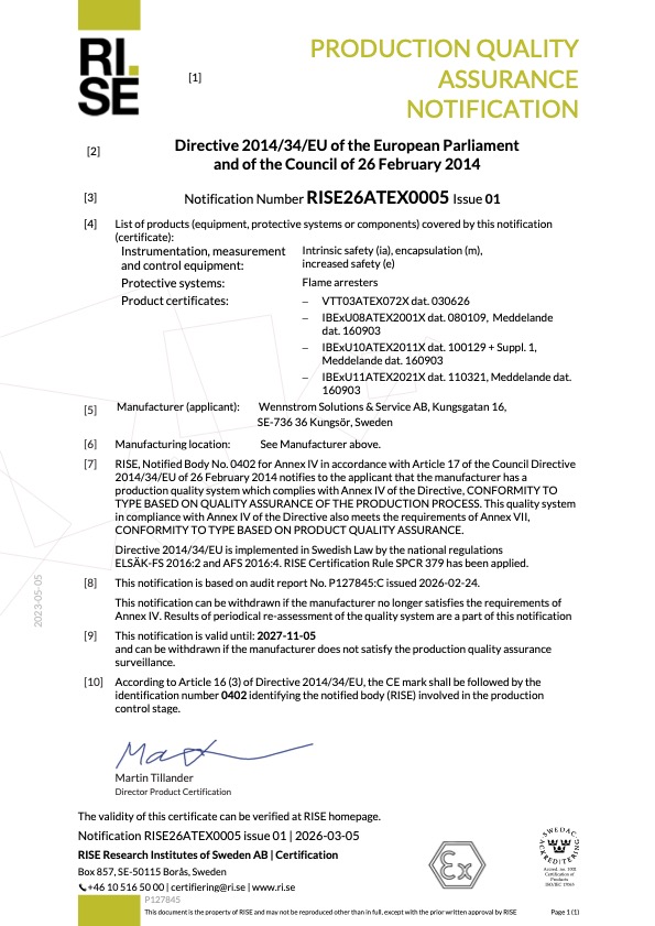 I samband med fusionen mellan Wennstrom Flow Control AB och Wennstrom Solutions & Service AB har det i slutet av januari genomförts en uppföljande revision av vårt ledningssystem för ATEX. Revisionen genomfördes av vårt anmälda organ Ri.se och gav oss fortsatt godkännande för produktion och försäljning av våra ATEX-produkter.